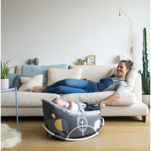 Durch das geringe Gewicht des *doomoo seat* ist er überall verwendbar und Sie können Ihr Baby immer in Ihrer Nähe haben – im Wissen, dass es hervorragend liegt und durch den Haltegurt gesichert ist.